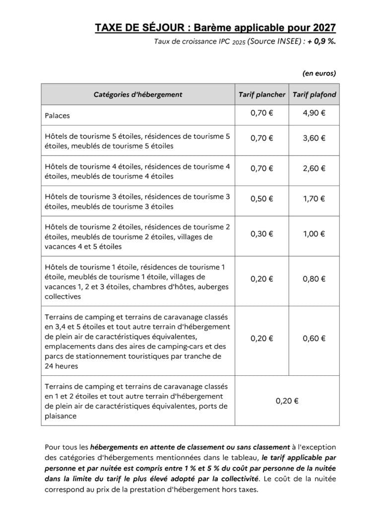 Le barème de la taxe de séjour applicable en 2027 est identique à celui appli...